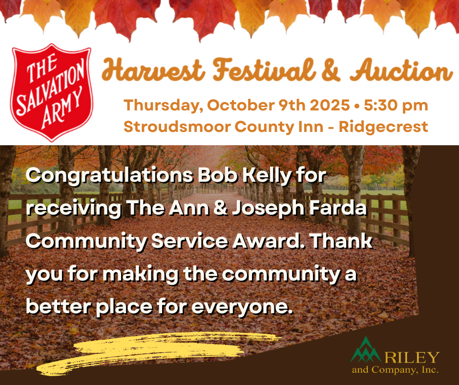 Riley and Company Inc. is proud to be a sponsor for the Salvation Army Annual Harvest Festival & Auction, which will be held on October 9th. This year’s event honors Bob Kelly with the 10th Annual Ann & Joseph Farda Community Service Award.